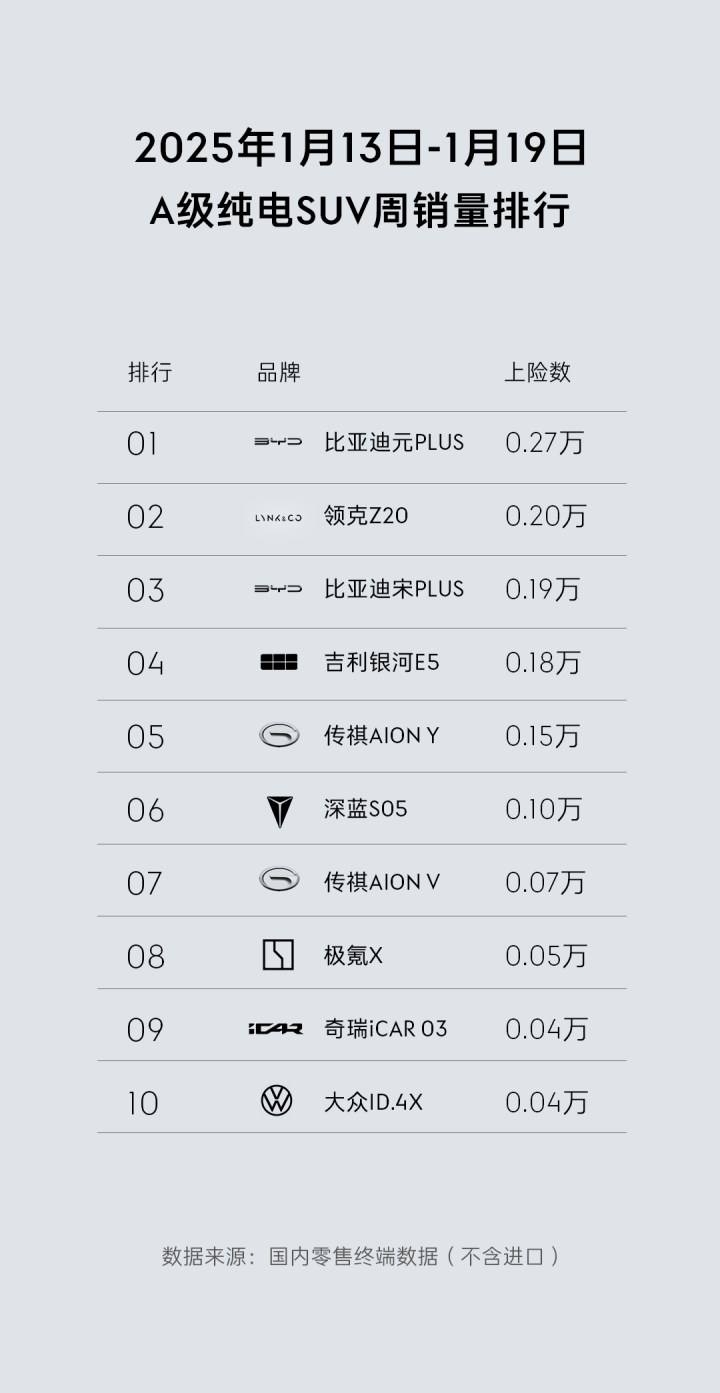 在辞旧迎新的喜庆气氛中,汽车界也掀起了一股新的竞争狂潮。但有一款车型,却在这场风潮中独树一帜,它就是备受瞩目的领克Z20。新年的钟声还在耳边回荡,而领克Z20已经在2025年第三周的A级纯电SUV销量排行榜上大放异彩,以0.2万辆的上险数稳坐前列,用实绩证明了它的市场影响力和消费者的高度认可。